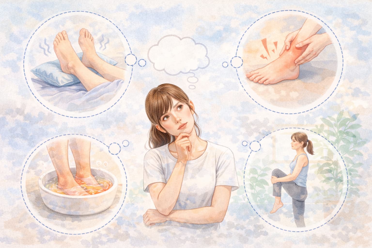 足を少し高くして休む、就寝前に軽いストレッチを行うなど、無理のない範囲で整えることが大切です。