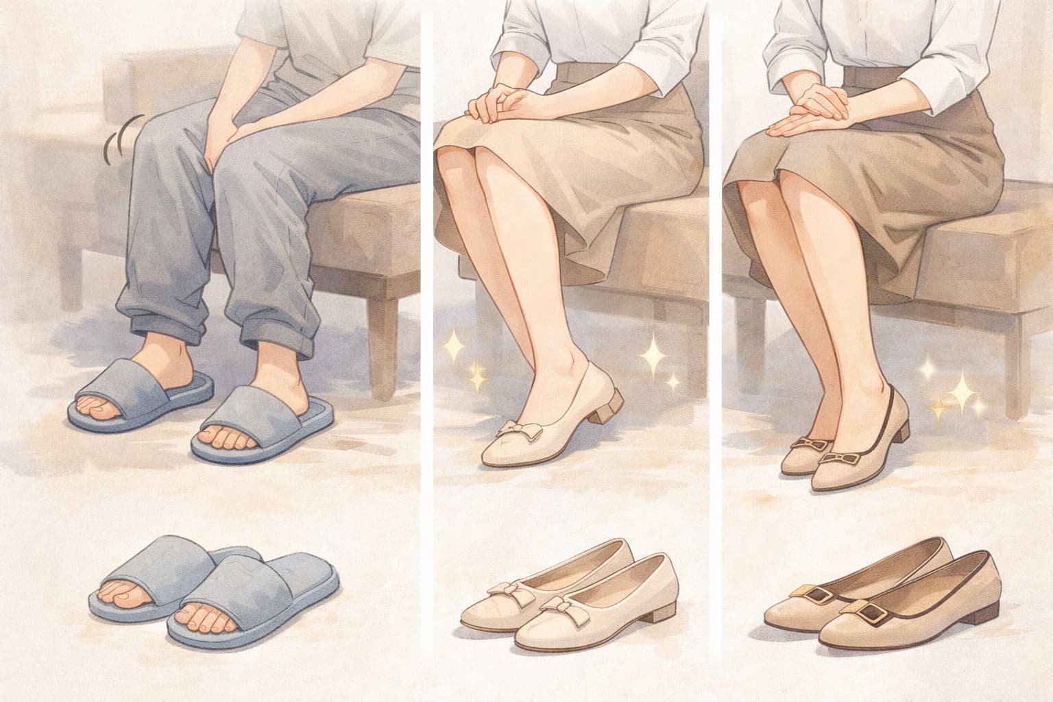同じ楽な履き物でも、甲の見え方ひとつで印象が変わることを意識しておくと選びやすくなります。