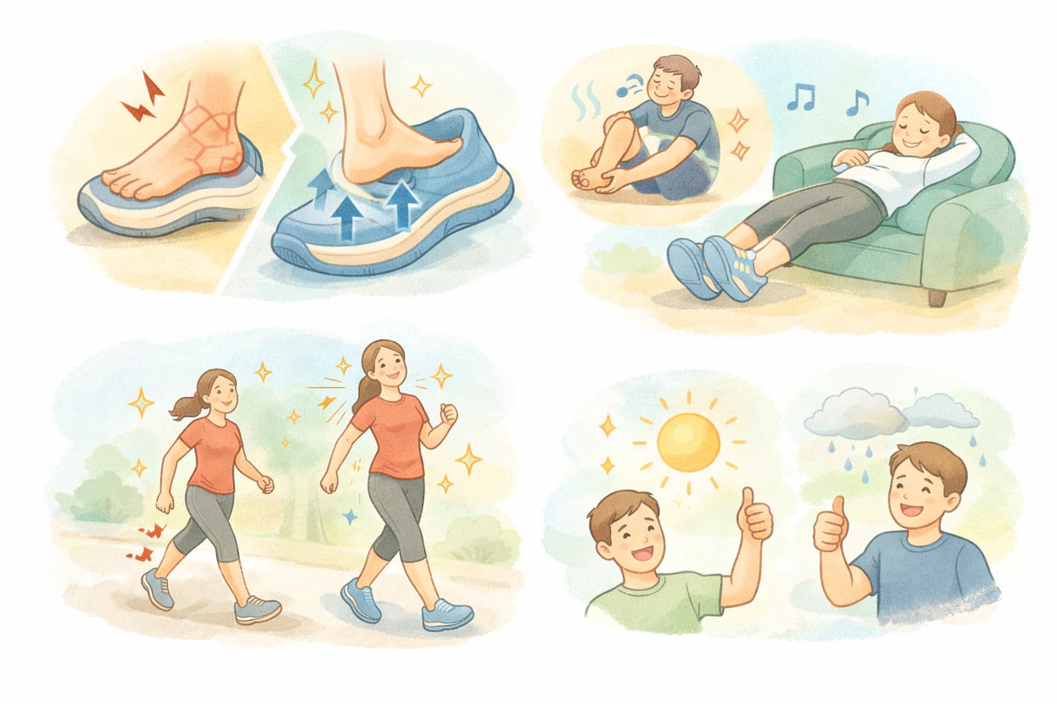かかとや前足部への一点集中を避けることで、局所的な痛みやだるさを軽減します。