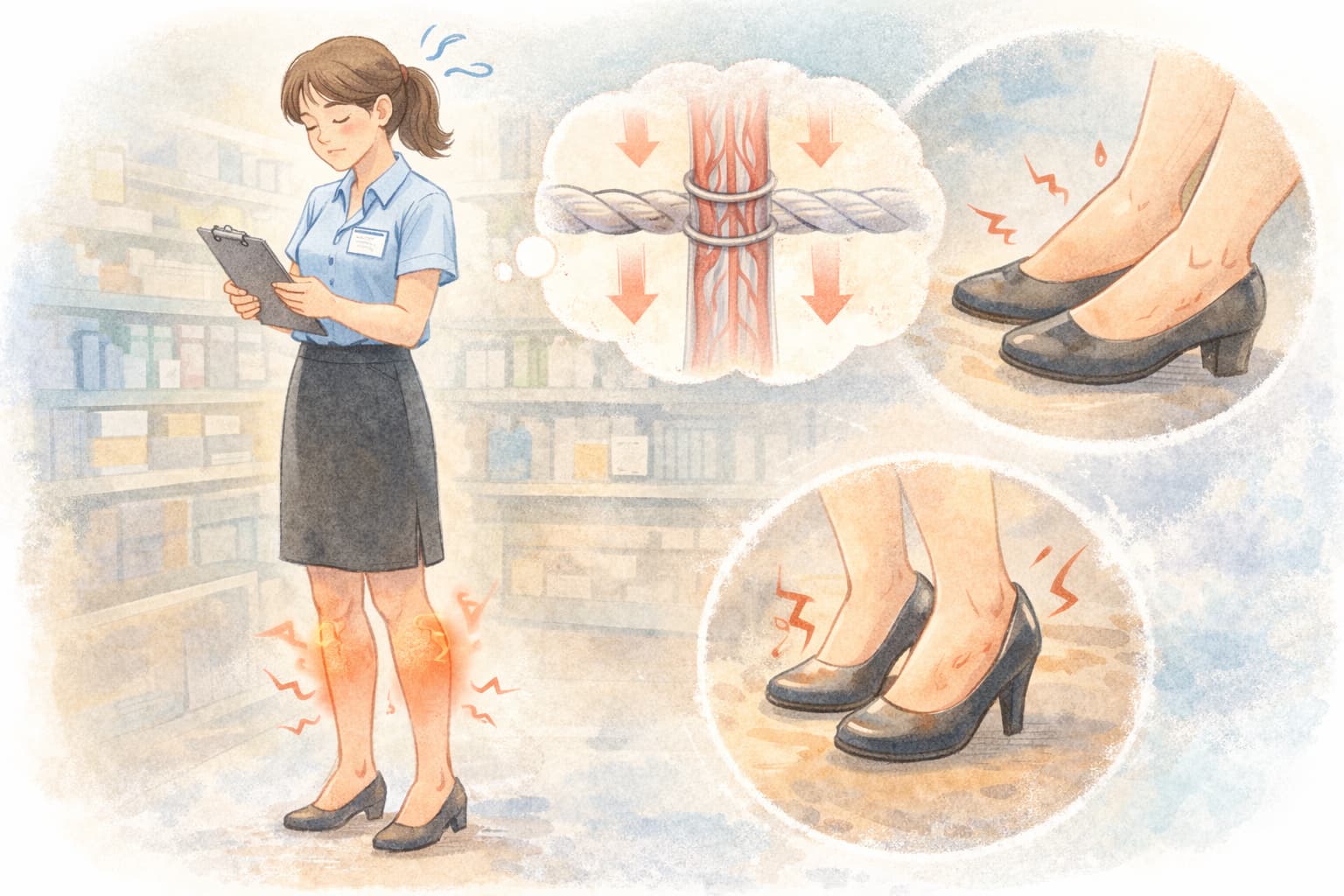仕事が終わるころになると、足が重い、だるい、張っている、靴を脱ぎたくてたまらない——そんな感覚に襲われることはありませんか。